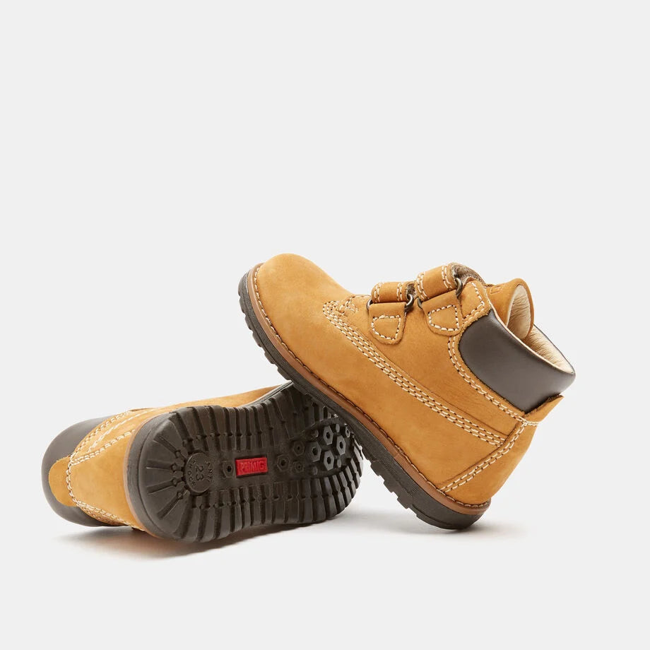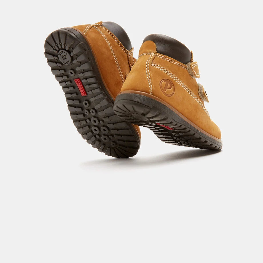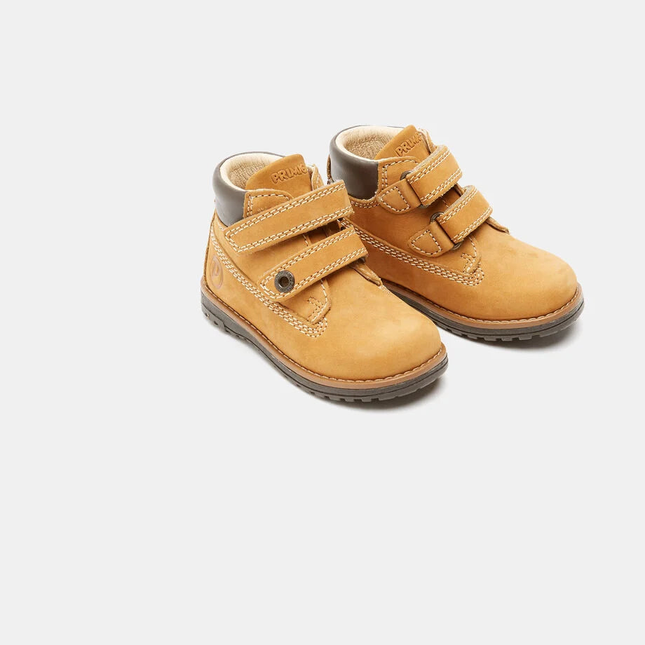 Stivaletto i lartë për fëmijë “first steps” në nubuk, me mbyllje me dy rripa, sole me stil “track” dhe kyç i forcuar.