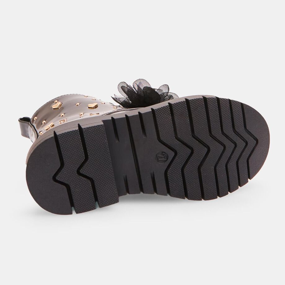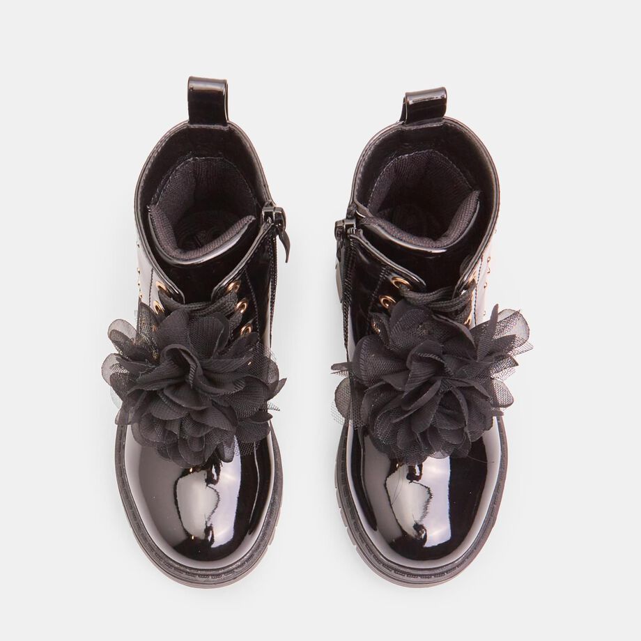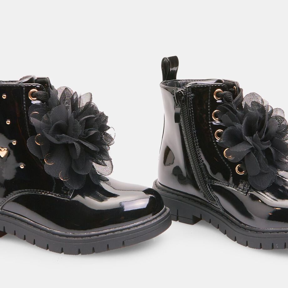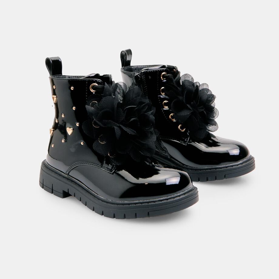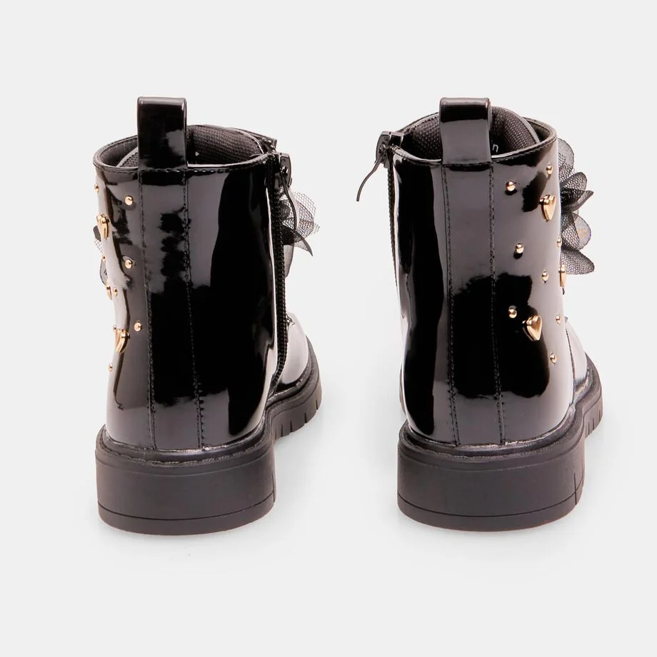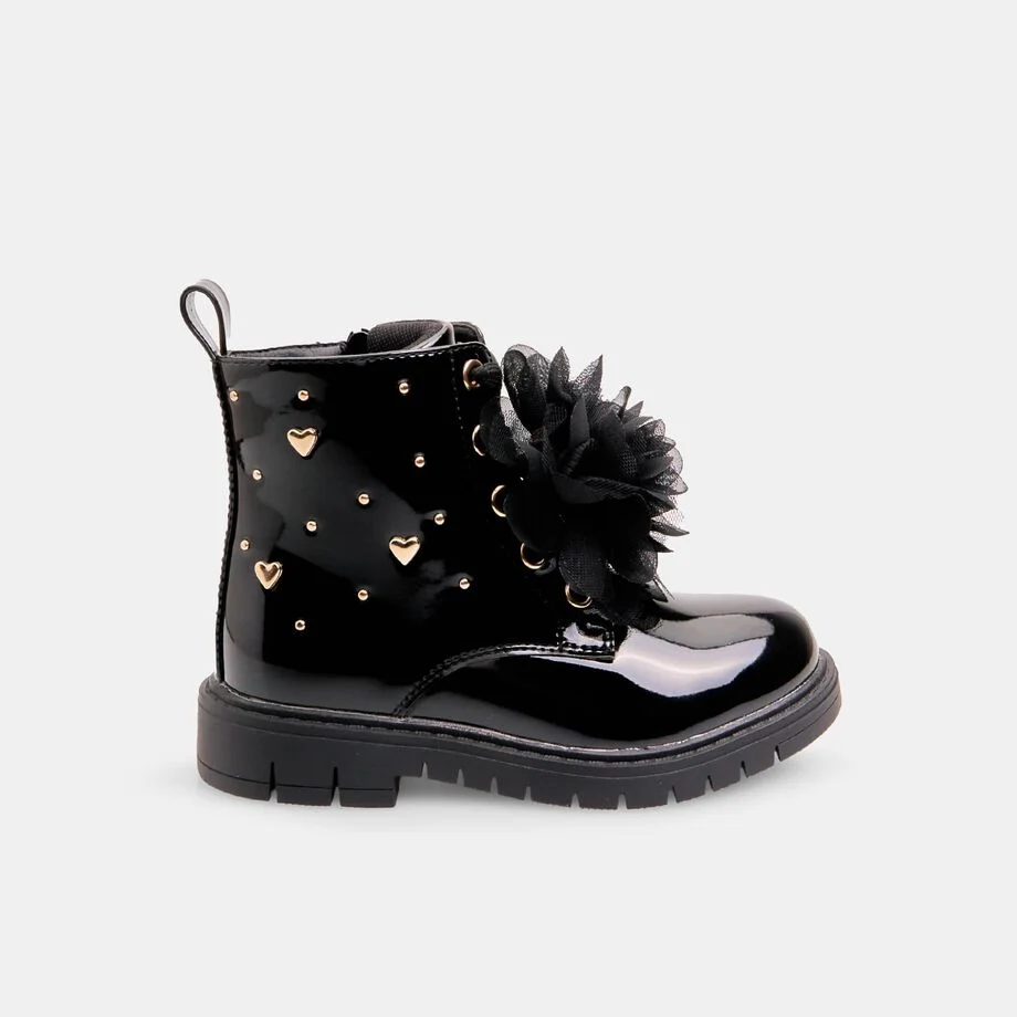 Çizmet për vajza Bubblegummers deri në kyçin e këmbës, me lidhëse dhe aksesor të lëvizshëm që mund të kthehet në një fjongo për flokët. Kanë zinxhir anësor të brendshëm për ta bërë veshjen më të lehtë, pjesë të sipërme të shkëlqyeshme me zemra të aplikuara, dhe taban TPR rezistent dhe anti-shkallëzues me gropa për fleksibilitet më të madh. Këto çizme ofrojnë stil, rehati dhe siguri gjatë lojës dhe përdorimit të përditshëm.