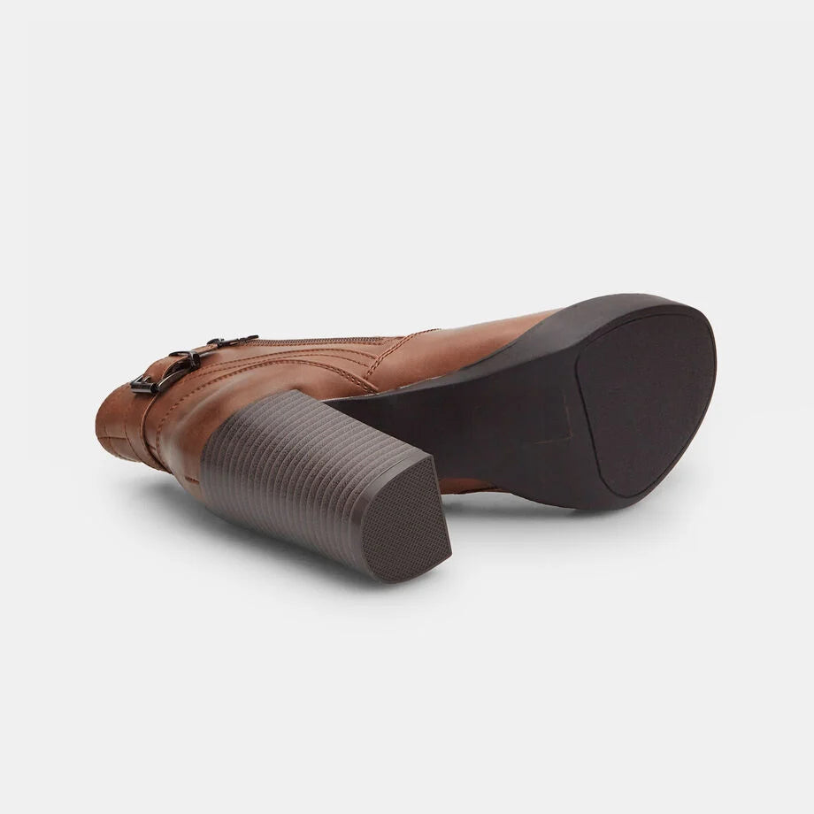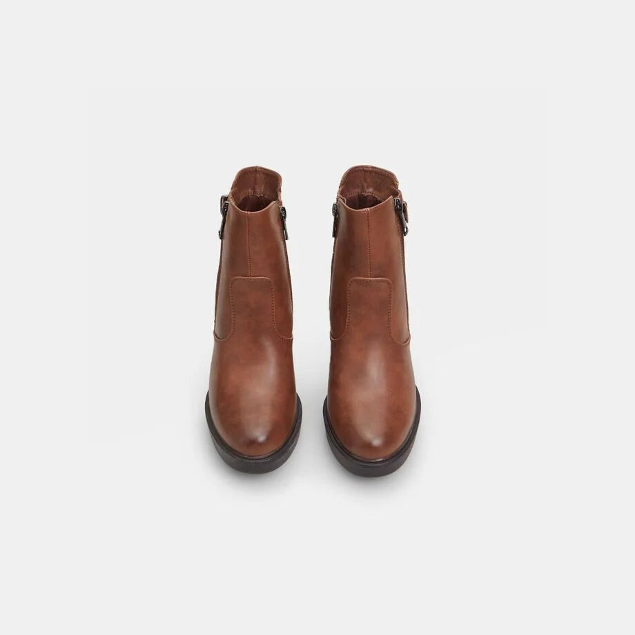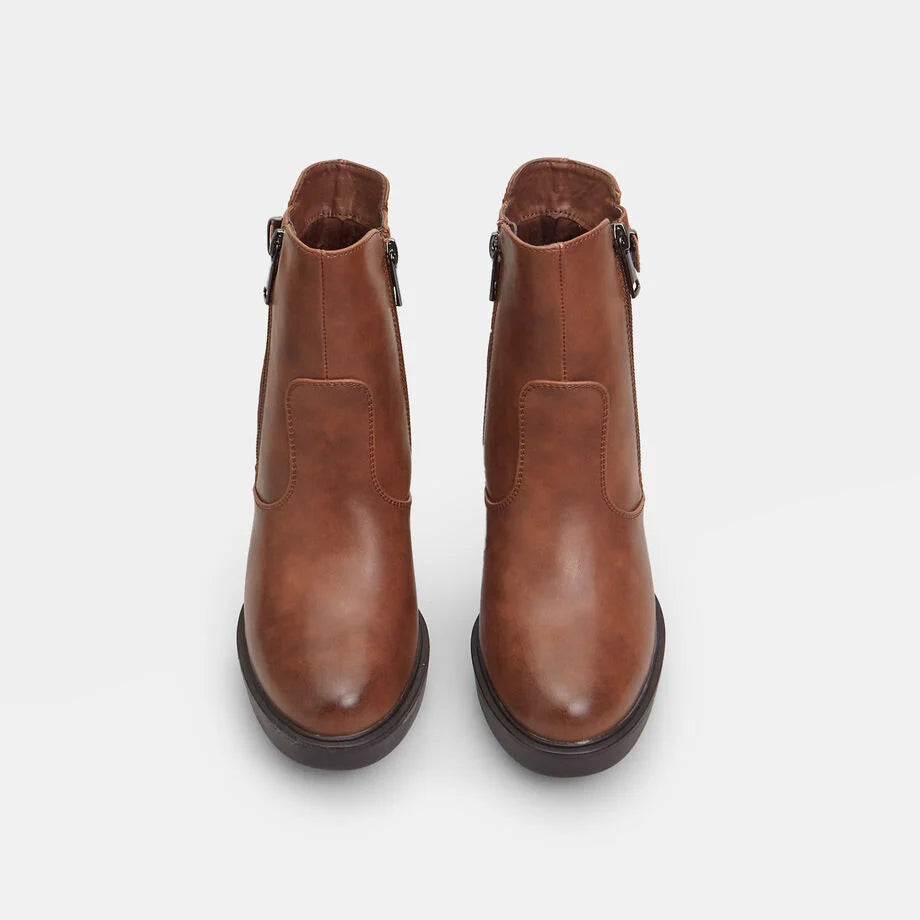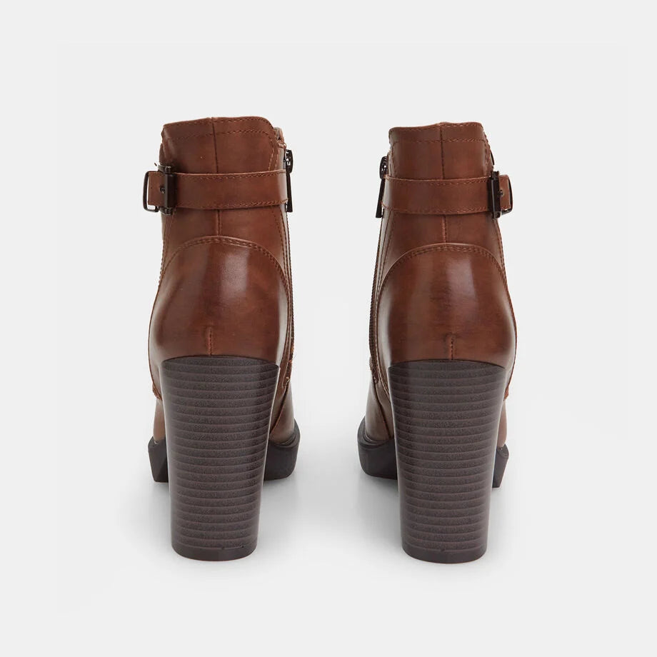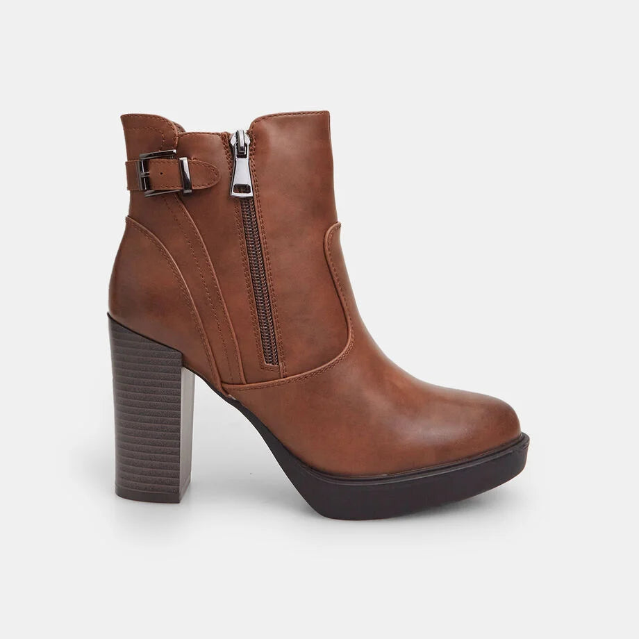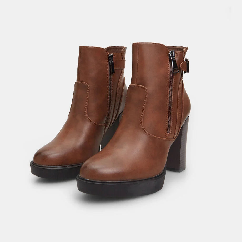 Çizme të shkurtra për femra me takë 10 cm dhe platformë 2 cm, me pjesën e sipërme të pajisur me dy zinxhirë anësorë dhe një rrip me kapëse dekorative