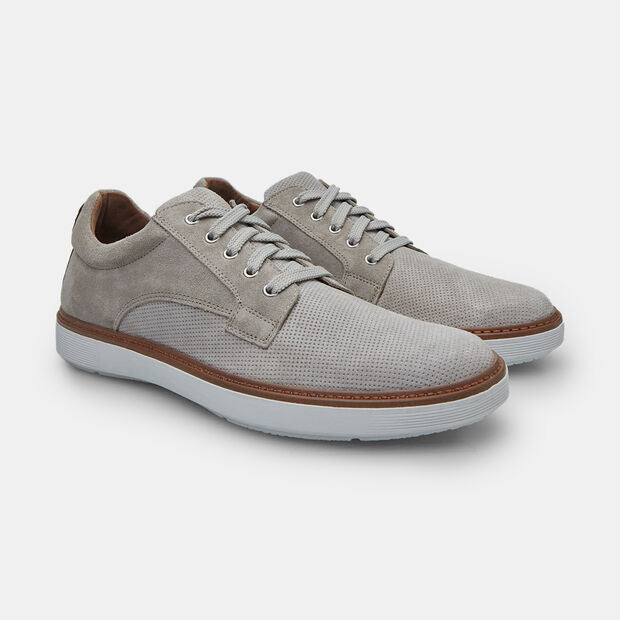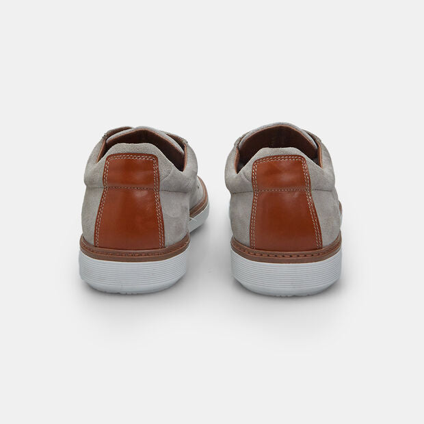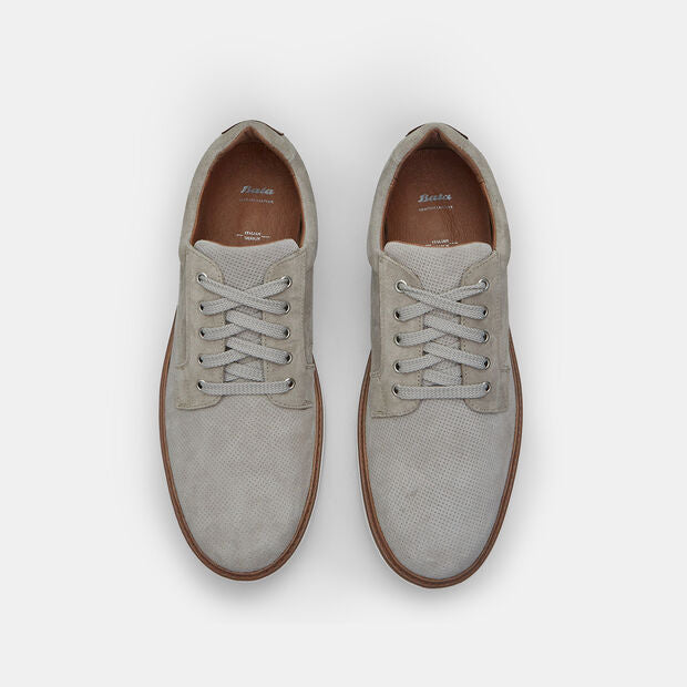 Këpucë me lidhëse për meshkuj prej suede, me shtresë të brendshme prej lëkure, pjesë të sipërme të shpuar dhe shollë të bardhë prej materiali të ngjashëm me gomën.