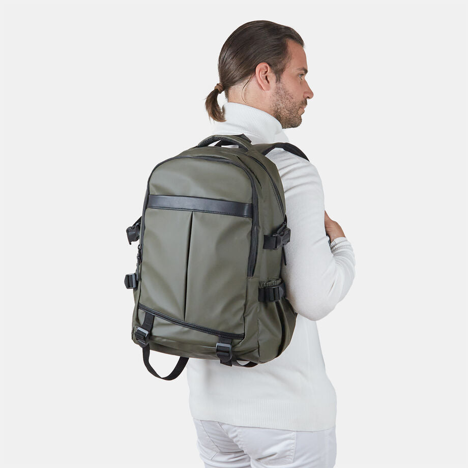 Çantë shpine për meshkuj me dy ndarje të brendshme me mbyllje dyfishe me zip, rripa shpatullash të jastëkuar dhe të rregullueshëm, xhepa të jashtëm dhe grepë anësorë të zgjatshëm për të menaxhuar kapacitetin, xhep frontal dhe dorezë.Lartësia: 30 cm,Gjerësia: 15 cm,Thellësia: 46 cm