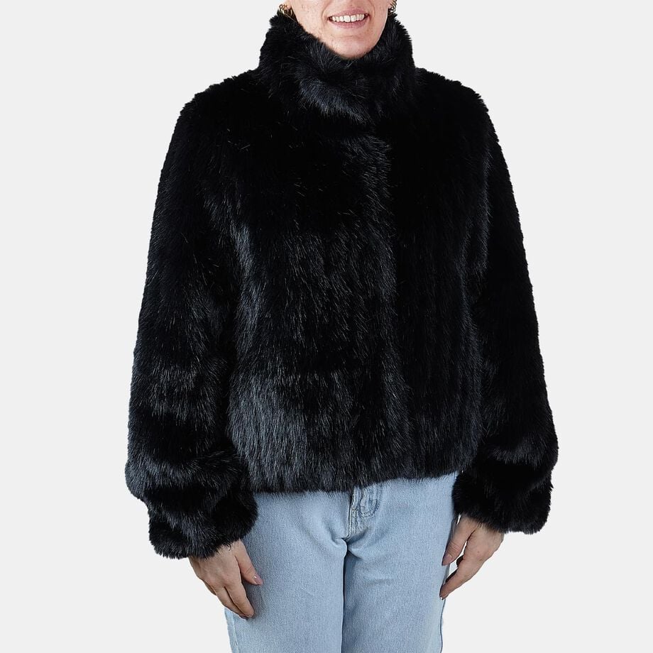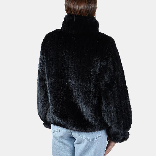 Xhaketa për gra prej pellushi sintetik, model i shkurtër me efekt rrëshqitës. Ka jakë dhe mëngë të gjata, duke ofruar ngrohtësi, rehati dhe një stil elegant për veshjet dimërore.