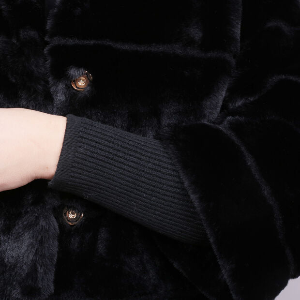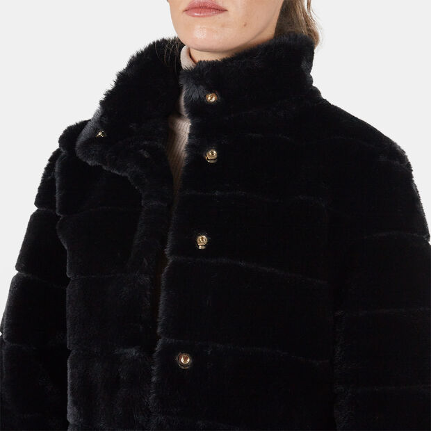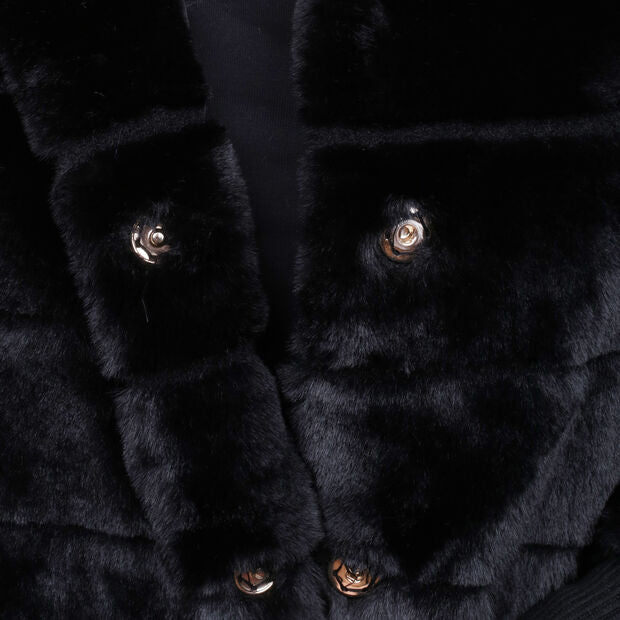 Xhaketa për gra, model eco-pellushi, me jakë të lartë dhe mëngë tre-katëshe. Ka shtesë me rib në mëngë deri te kyçet, mbyllje me butona të fshehur dhe xhepa anësorë, duke ofruar ngrohtësi, rehati dhe stil modern dhe të sofistikuar.