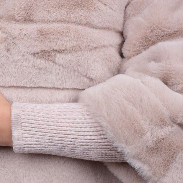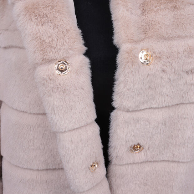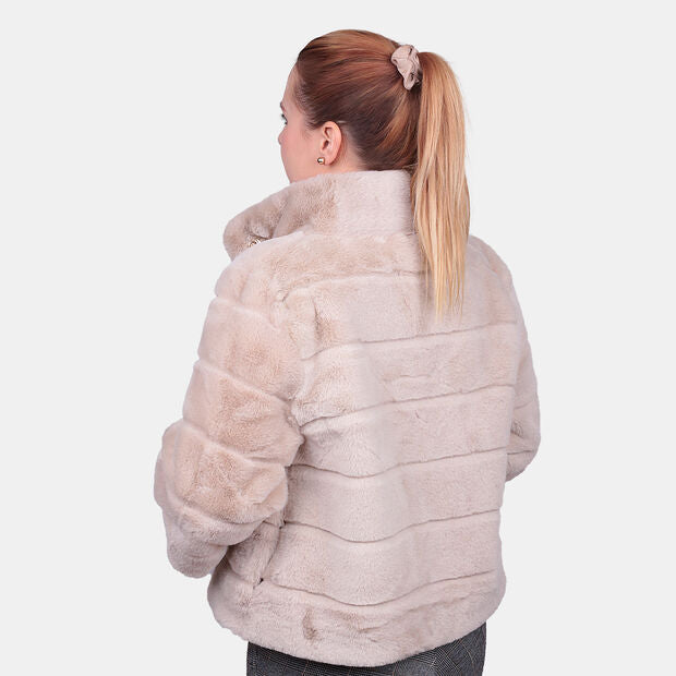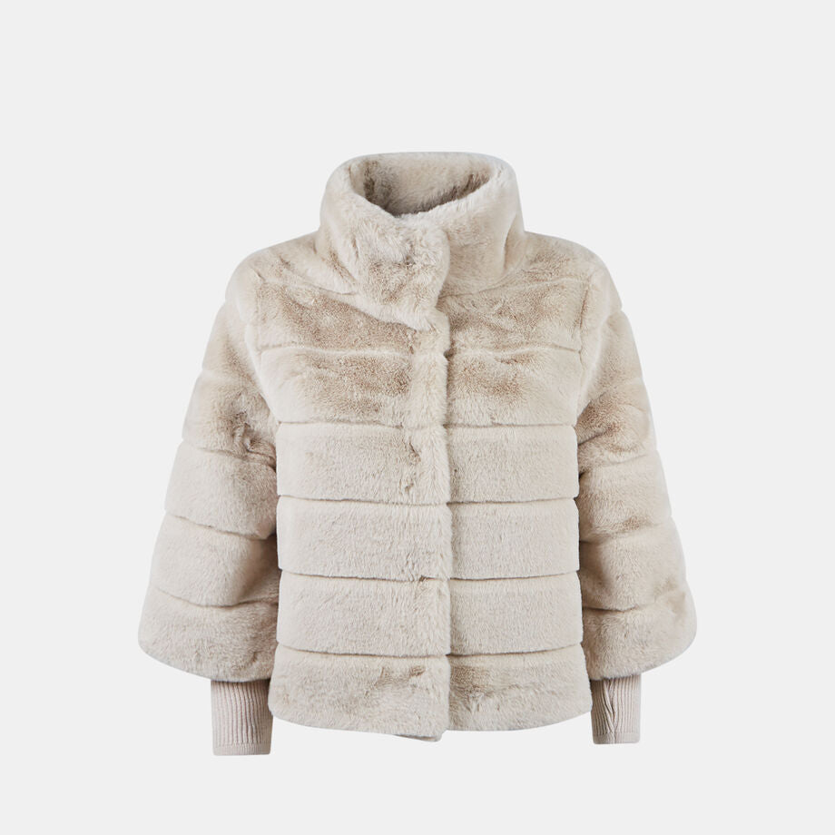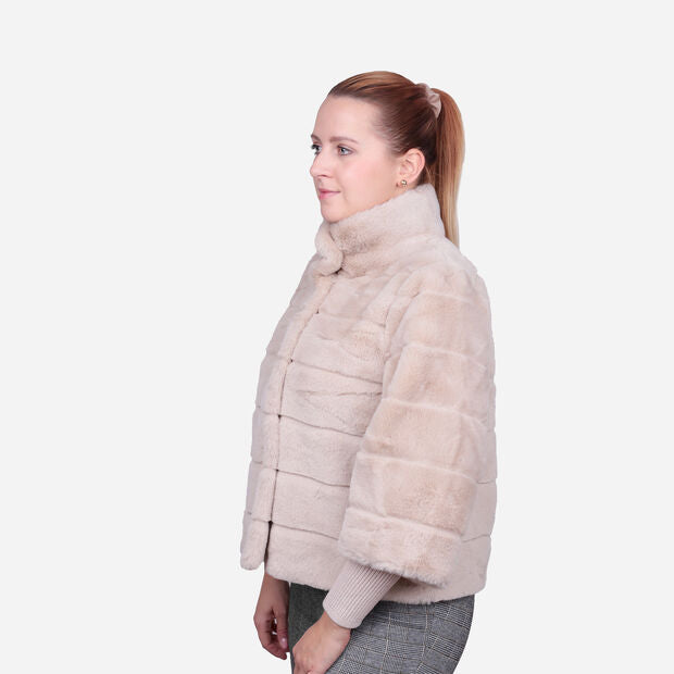 Xhaketa për gra, model eco-pellushi, me jakë të lartë dhe mëngë tre-katëshe. Ka shtesë me rib në mëngë deri te kyçet, mbyllje me butona të fshehur dhe xhepa anësorë, duke ofruar ngrohtësi, rehati dhe stil modern dhe të sofistikuar.